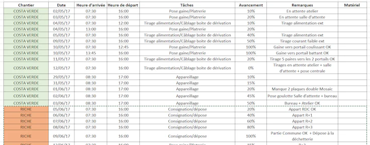 Exemple de tableau de suivi de chantier sous Excel :